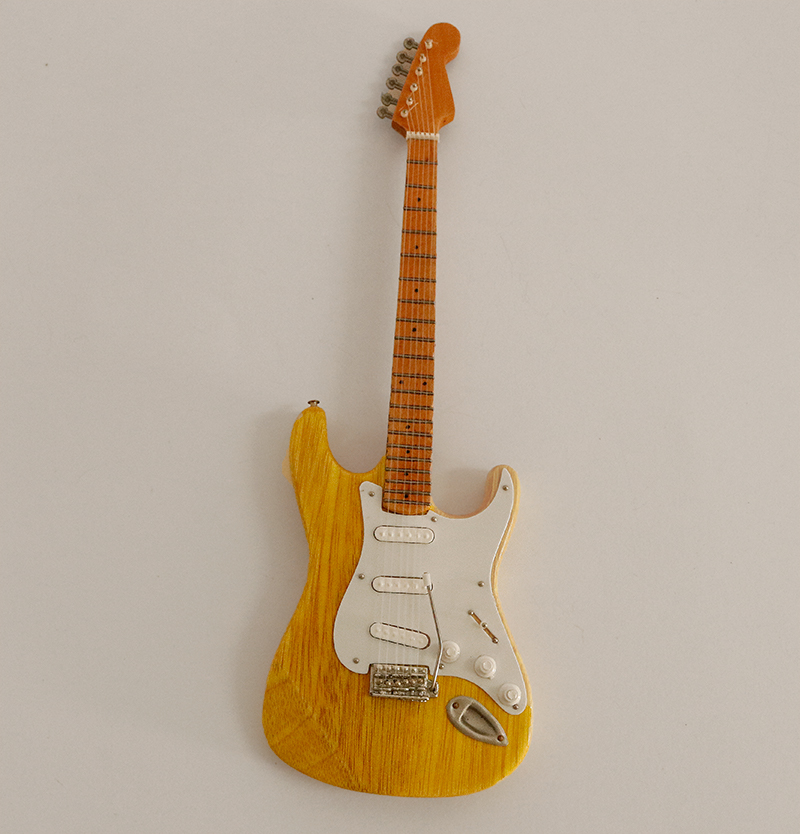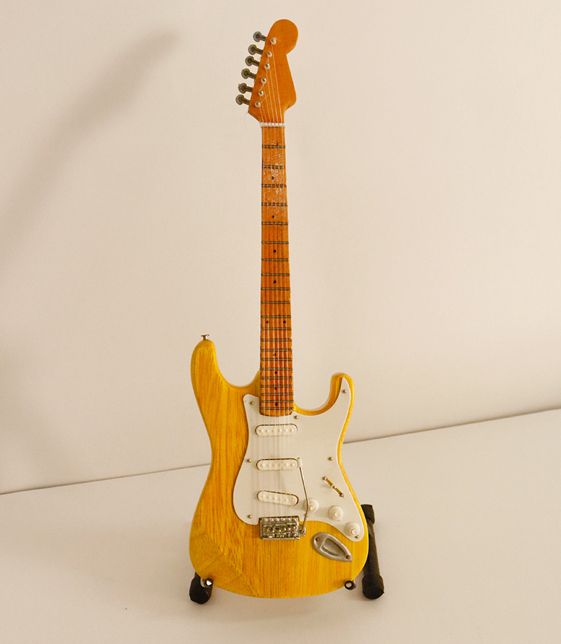 Miniatura de guitarra Stratocaster Gold Leaf (Eric Clapton) con soporte.Medidas de las guitarras entre 24 y 26 cm de altura