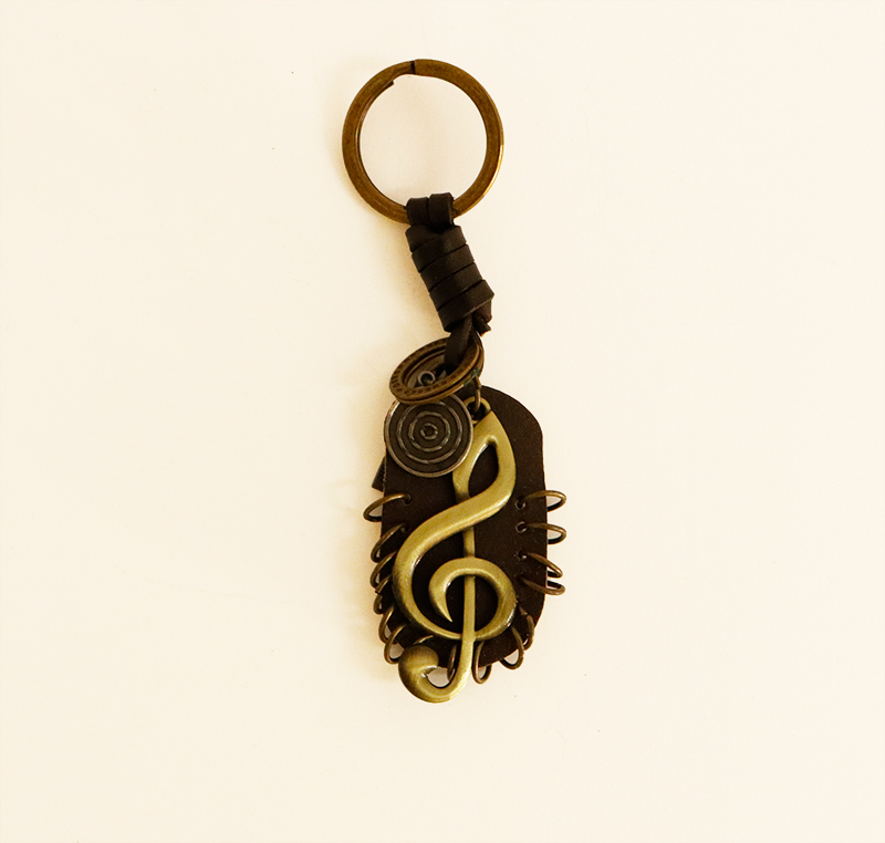 Elegante llavero de cuero con Clave de Sol color bronce.Con acabados de cuero